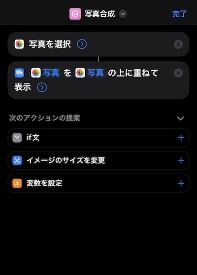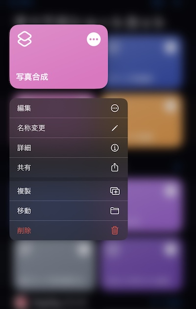 ショートカットのタイトルもわかりやすく「写真合成」に変更しておきます。またホーム画面にアイコン表示させておきましょう。作成した写真合成をタッチして「共有」を選んで設置します。