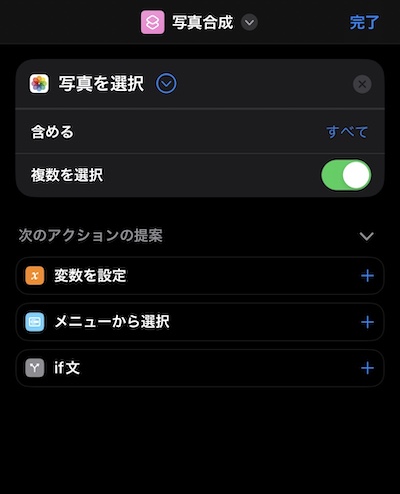 まずショートカットの右上の+ をタップ。すると下部に検索窓が表示されますので、ここに「写真」と打ち込みます。
